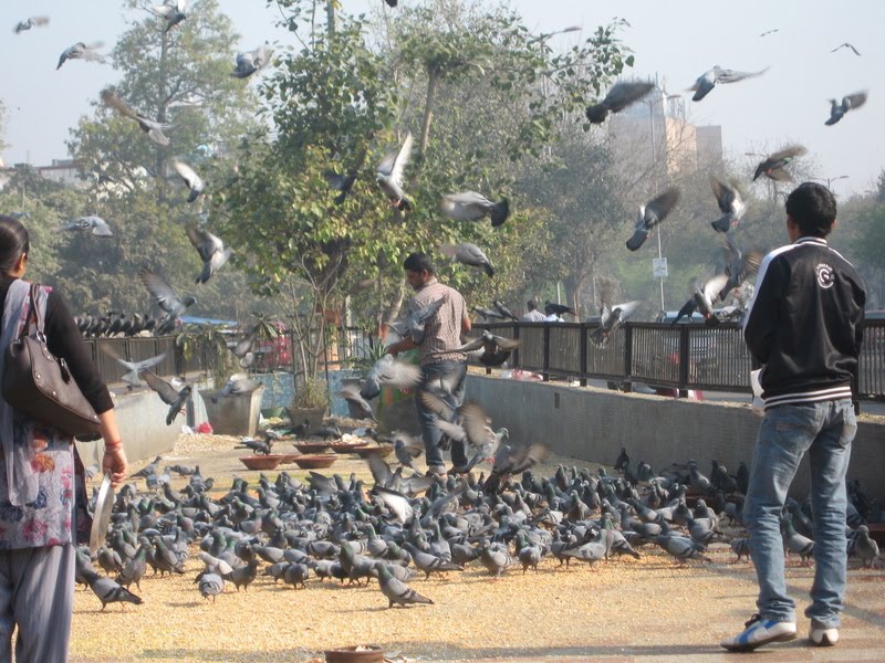 The other day I was in a rickshaw and my driver stopped and pulled over at the median and told me it would be one minute. Rickshaw drivers tend to pull over every now and then to get snacks, tobacco or to relieve themselves, so I wasn't surprised he was stopping... but it was weird we were stopping in the middle of the street! The driver got out and paid for a bowl full of birdseed and then started feeding the birds.