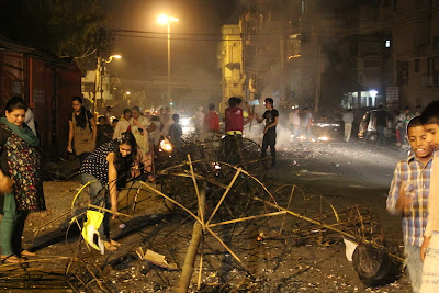 This year, our neighborhood was quite active for Dusshera. At one end of our street, one of the major political parties here, set up a Dusshera celebration. Here are some guys putting the effigies together and filling it full of fireworks!
